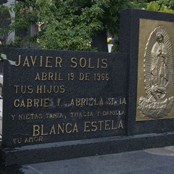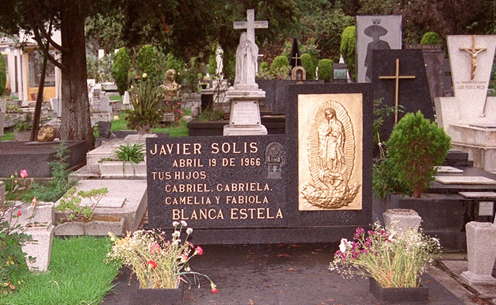 Así como hay calles que cambian su nombre al de Javier Solís, también la tumba de Javier Solís ha visto cambiar sus nombres. Me explico. Recién con este pasado aniversario luctuoso y sus fotografías es que me doy cuenta de un detalle: la lápida de Javier Solís ha sido modificada. Hace más de diez años ocurrió el cambio, la fecha exacta no la sé, intenté averiguarla sin éxito. En las imágenes de internet se ve sobre todo la actual, pero buscando un poco más en el tiempo uno logra dar con la primera versión de la lápida. Así, aquella primera versión contenía los nombres de Javier, sus cuatro hijos (Gabriel, Gabriela, Camelia y Fabiola) y de Blanca Estela (última pareja de Solís); hace más de diez años se modifica la lápida: se quitan los nombres de Camelia y Fabiola, se ponen los apellidos de Gabriel y Gabriela Siria, se ponen los nombres de las nietas (Tania, Thalia y Daniela) y se agrega “tu amor” a Blanca Estela.