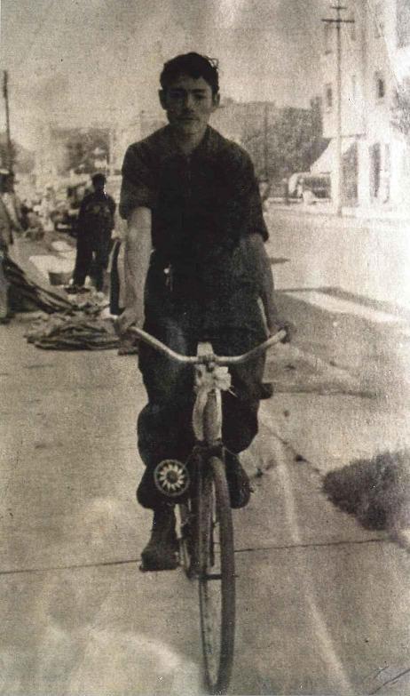 Una postal que nos llega a través de la trilogía «El Señor de Sombras: la vida de Javier Solís» (J. F. Coria, Ed. Clío, 1995) del archivo de Valentín Levario (padrino de Javier). El pie de foto indica que, «así se le vio durante años por la Condesa y Tacubaya»; hoy día las bicicletas, al parecer, vuelven a ser protagonistas de historias, ¿en alguna habrá un Javier en ciernes? Seguramente: en una bicicleta se mueven mejor los sueños al estar en contacto directo con el aire y, al mismo tiempo, con los pies más cerca del suelo. Solís lo supo (acaso por necesidad y no por gusto) y sin duda en cada pedaleada se forjaban notas de aquél carácter que haría de él un artista cabal. Todavía más, quizá su pedaleo ominó su seguro andar vocal y fue así piedra de toque de su canto, de su encanto.